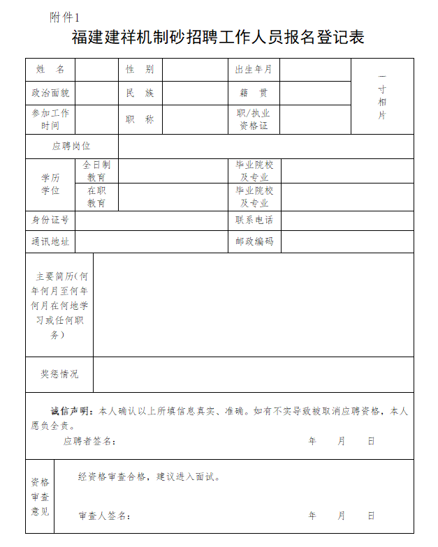 附件1:福建建祥機制砂招聘工作人員報名登記表