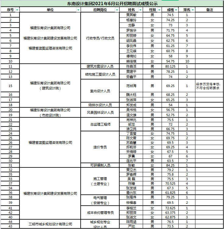 東南設(shè)計(jì)集團(tuán)2021年6月公開(kāi)招聘面試成績(jī)公示